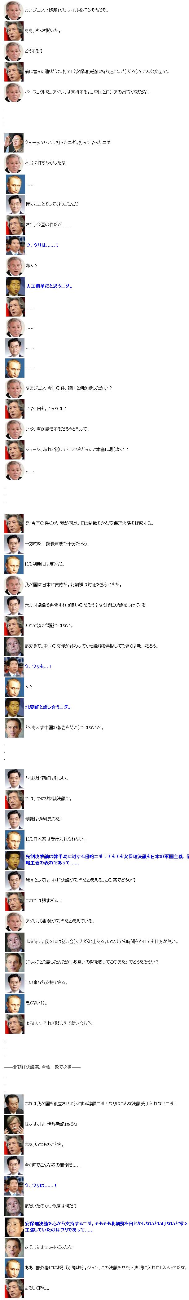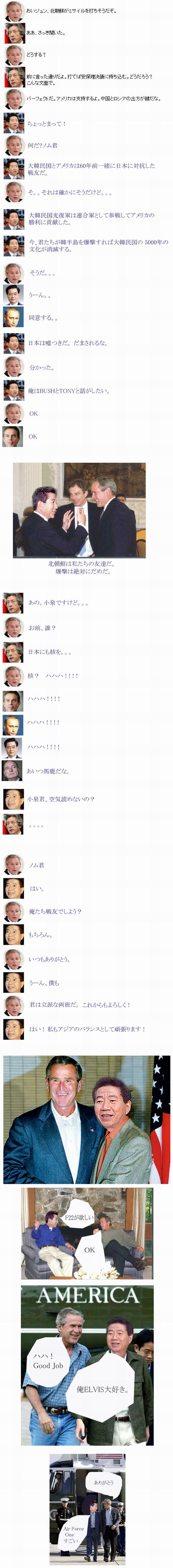 私のゲームソフトを持って!(笑) 嗚呼!あと3〜4時間もすれば出来るのよぉ〜!\(⌒▽⌒)/ ↑ダメ人間的発言(笑) でも、なんかそーゆー気分で待ち通しってのは、正直な気持ちなんだもん! ここ数日間のアタイは過去のブログを読んでいただければ、わかるかもしれんが、 とにかく、オカンが持ち帰るゲームの事で頭がいっぱい!←年頃的にやばい(笑) タイミング悪く、仕事もそんなに忙しくなかったので、ヒマにまかせて、 公式サイトからムービーをダウンロードして来て見てたり、 まだ始めてもいないゲームの攻略サイトとかみてワキワキしてたり。 大変ダメ人間っぷりを発揮していた。 しかし、そんな事してるのも限界がある。精神的に(笑)。 つーわけで、気を紛らわそうと、ネットをしているウチに、 にわかに「韓流ブーム」の波に飲み込まれてしまった!! って、言っても、「パ」とか「ピ」とか「プ」とか「ペ」とか「ポ」とか よく分からんが、そんなカンジの韓タレ達に夢中!とかってんじゃなくね。 韓国という国やら人やらを面白可笑しく「紹介」…ていういか、笑い者にしてる ブログにはまったおかげで、にわかに韓国に詳しくなっているのだ!(笑) 前回のブログのネタもそこから拾って来てる(笑)。 もっと人生に役立つような時間の使い方をしろよ!と呆れてる?(笑) もともと、サッカー関係で 「ま〜たナメたことほざいてんじゃねーだろーなっ!」と 朝鮮日報にブックマークを入れてた私ですが(笑)、 政治系ページは見た事はなかった。 日本の政治とかもあんま興味ないのに、他国の政治なんて、 もっと興味ナッスィング!(笑) そんな私が何故、韓国情勢に興味をもったのかっ?! と、いうのも、実は、お恥ずかしい話、 北朝鮮のミサイルを乱射したリアルタイム頃、 私はそのニュースを一切知らんかった!(笑) マミー達が居ない事をいい事に、テレビは24時間アニマックスだったし、 おまけに仕事も忙しかったので、ネットも殆どしてなかったし、 相変わらずのヒキコモリだったので、どこからもそんな情報が入って来なかったのよ。 って、わけで、仕事がナニゲに一段落した8日頃、 ふと、ヤフーで何かを検索しようとした時、画面右隅の「トピック」で 北朝鮮のミサイル発射問題みたいな見出しを見つけ、何ですとー!と 言う事で、調べ始めたのが、きっかけ。 色々調べてるうちに韓国の反応とかのニュースで「おや?」みたいな 事を言ってるのから、韓国の事を調べてみよう、と思い、 「そういえば、朝鮮日報(日本語版)にブクマ付けてたな…」と 調べてみたら! (゚Д゚)ハア?的な事を大統領や、閣僚関係の人がモリモリ言ってて、 他にもどんなナメた事言ってるんじゃろか〜! と興味が湧いてしまったのが運のつき?!(笑) だってさあ、お隣の国で明け方ミサイルぶっ放されてんのに、大統領は ぐーすか寝てて、対応も日本に較べて後手後手だったのを、 マスコミに指摘されたら、 「朝からみんなで会議したって意味ないじゃん!てか、日本は大騒ぎしすぎ!」 とか、 「日本はミサイル問題を理由に調子に乗って軍備強化してるー! 先制攻撃とかもする!とか言ってるーーーー!ぜってー許せねーー! そっちがその気なら、負ける覚悟でこっちだってやってやるっ!!」 って、あんた、アベッチは 「もし、日本がマジヤバかった時の事を考えて、 そしたら先制攻撃もアリっちゃ有り?やられてからじゃおっせーし。 オレら的にもちょっと考えといた方がいいよね?相手はキチガイだし…」 って、言っただけなのに、 もう先制攻撃宣言したーー!と言わんばかりに逆ギレ、てか、謎ギレ(笑)。 てゆーか、変な所で大騒ぎはオマエだから!みたいな?(笑) ポイントはまだはっきり「先制攻撃するし!」って言った訳でもない日本より、 はっきりしっかりくっきりミサイルぶっ放してる あんたっとこのお隣さんじゃん?って、常識的に考えても、 子供でも分かりそうな事、大統領とか言っちゃうのが凄くね?(笑) 日本に武装拡大されたり、先制攻撃論とか出されたくないなら、 オマエや中国がもっと働かんかい!!! ってカンジだよね(笑) やる事やらねえから、日本が「ヤバいかも…」ってなって、 「当てにならねーやつはほっといて、自分の身は自分で守らんとね…」、 ってなってるんですけど?みたいな。逆ギレというか、先ギレもいいとこだよね(笑)。 |