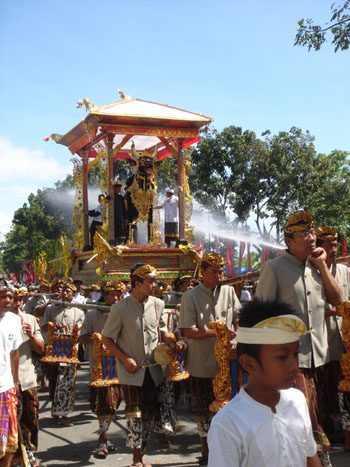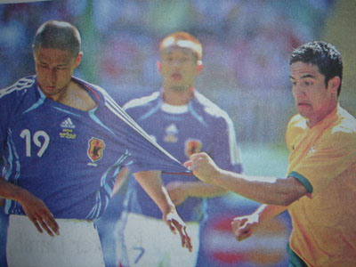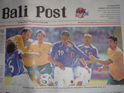 みなさんはどこを応援するの?…って、日本に決まってんじゃん!って?(笑) …そうね、是非がんばって頂きたいわね。 いつか「強豪」呼ばわりされるようになる為に、地道に成績を残して頂きたいわ。 それにしても、最近、バリでは一般民家の軒先に色んな国の旗が掲げられています。 どうやらワールドカップに関するものらしく、 「優勝すると予想する国」だか、「賭けをしてて、自分が賭けてる国」だか、 「応援している国」の旗を揚げてる、のかは謎だが、 フランスの旗が比較的目立つ気がします。 あとはイングランドやイタリア、スペインなんかも多いかな。 日本の旗は今まで見た事がない(笑)。 お父さんは、 「日本からの観光客が多いんだから、お世辞でも日本の旗揚げればいいのに」 と言ってます。 まあ、あの揚げてる旗の意味がなんだか、イマイチ分からんが、賭けに関しているなら、 そんな冒険はみんなしないだろうなあ(笑)。 それでも、こないだのドイツとの親善試合で、2−2で引き分けたので バリ人の間では日本サッカーの株が随分上がったようです(笑)。 昨日のグランタンの練習の時、スタマ先生に 「今回のWC、どこが優勝すると思う?」 って聞いたら 「日本。こないだのドイツとの試合、凄かったね!ナカタ、ナカムラ、タカハラ、みんな凄いね!」 って言うから、 「や、本当は?」と再確認したら、小さい声で「…ブラジル」だそうです(笑)。 どこが優勝か、は二の次で、 華麗なボール裁きとか、凄いゴールシーンとか、そーゆーのが楽しみだわん。 |